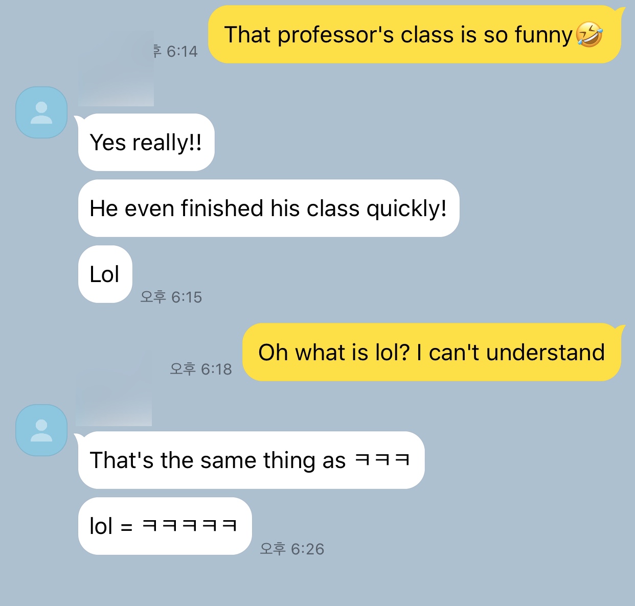 안녕하세요! 오늘은 저의 경험을 바탕으로 쓰여진 글입니다. 학교에서 사귄 외국인 친구와 문자를 주고받는데 친구가 갑자기 "lol" 이라는 단어를 보내더라구요. lol??? 영어 단어를 많이 외웠다고 생각했는데 처음 들어보는 용어였어요! 그래서 바로 "what is lol? I can't understand" (lol이 뭐야? 나 이해 못했어) 라고 보내니 그 외국인 친구가 "That's the same thing as ㅋㅋㅋ"(그거 ㅋㅋㅋ랑 같은 의미야) 라고 답장해주었습니다. 그래서 아, 외국인들은 ㅋㅋㅋ라는 한글을 쓰지 않으니 lol이라고 쓰는구나! 를 알게 되었습니다.
