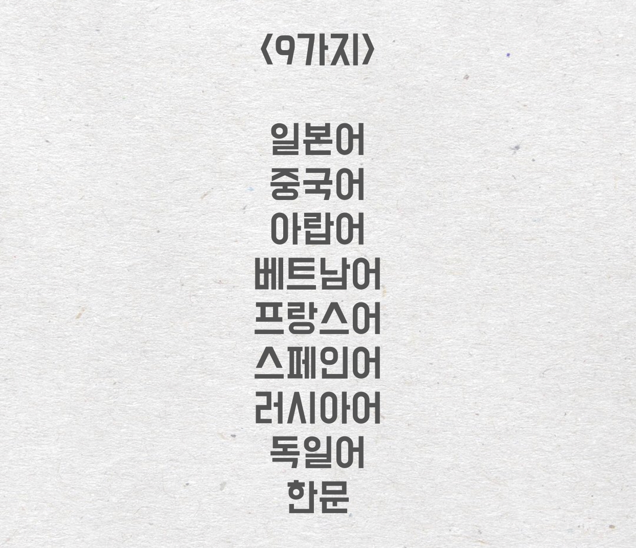 수능 제2외국어는 총 9개의 과목이 있어요. 바로 일본어/중국어/아랍어/베트남어/프랑스어/스페인어/러시아어/독일어/한문 입니다. 일본어나 중국어는 중학교 또는 고등학교 교과 과정에서 배우는 경우도 있는 것 같아요. 저도 학생일 때 중국어와 일본어 중에서 원하는 과목 한가지를 선택하고, 일주일에 한번씩 배웠던 기억이 납니다. 하지만 특정 고등학교가 아니라면 그 외의 나머지 언어들은 조금 생소하게 느껴질 것 같습니다. 사실 요즘 들어 학생들이 가장 많이 선택하는 과목은 '아랍어'라고 해요. 그 이유는, 아랍어를 배운 적이 없어 어려울 수도 있지만 다른 과목에 비해서 조금 더 성적을 받기 쉽다고 알고 있는 분들이 많기 때문입니다. 다른 인기 과목과 비교했을 때 아랍어를 잘하는 사람은 많지 않으니 오히려 더 많이 선택하는 것 같아요!