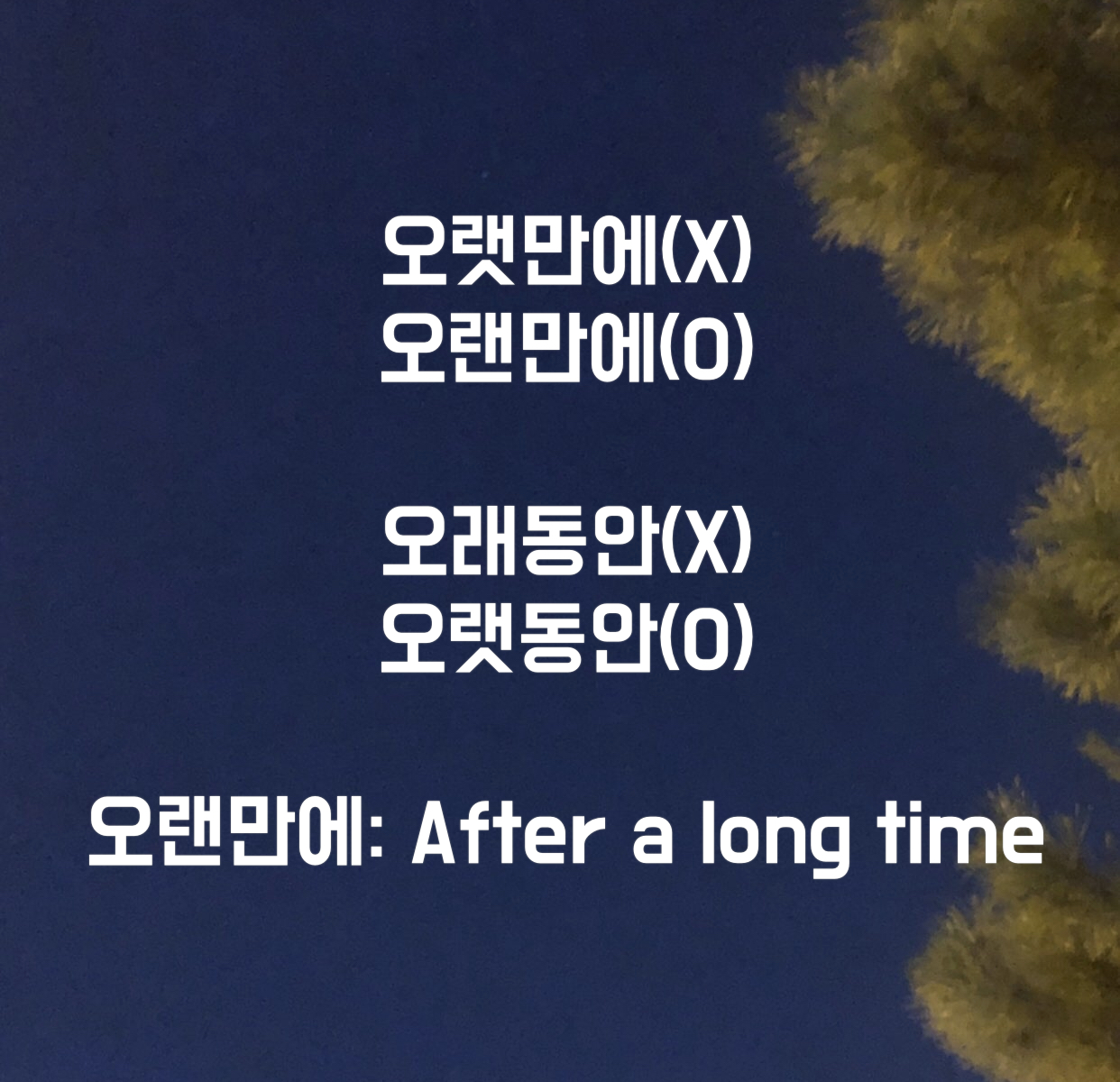 여기서 조금 더 헷갈릴 수 있는 것을 한번 생각해보면, '오래동안'과 '오랫동안' 중에서는 어떤 표현이 맞을까요? 제가 위에서는 시옷 받침이 들어간 오랫만에라는 표현을 쓰면 안된다고 해서 더더욱 어려울 수도 있는데요, 이 경우에는 '오랫동안'이 맞습니다. 무조건 시옷이 들어가서 틀리는 건 아니라는 의미입니다. 여기에서는 '오래동안'이라는 표현이 없는 표현입니다.