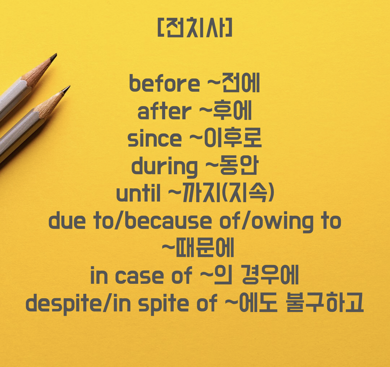 전치사와 접속사는 헷갈릴 수 있지만 일단 암기는 필요합니다. 이 부분의 문법은 이해보다는 암기라고 생각하는데, 단어를 보고 접속사인지 전치사인지 바로바로 판단할 수 있을 정도로 달달 암기하는 게 좋을 것 같습니다. 조금 헷갈리고 외울 것들이 있기는 하지만, 한 번 까먹지 않게 제대로 외워둔다면 그 다음부터는 문제를 빠르게 풀 수 있습니다.