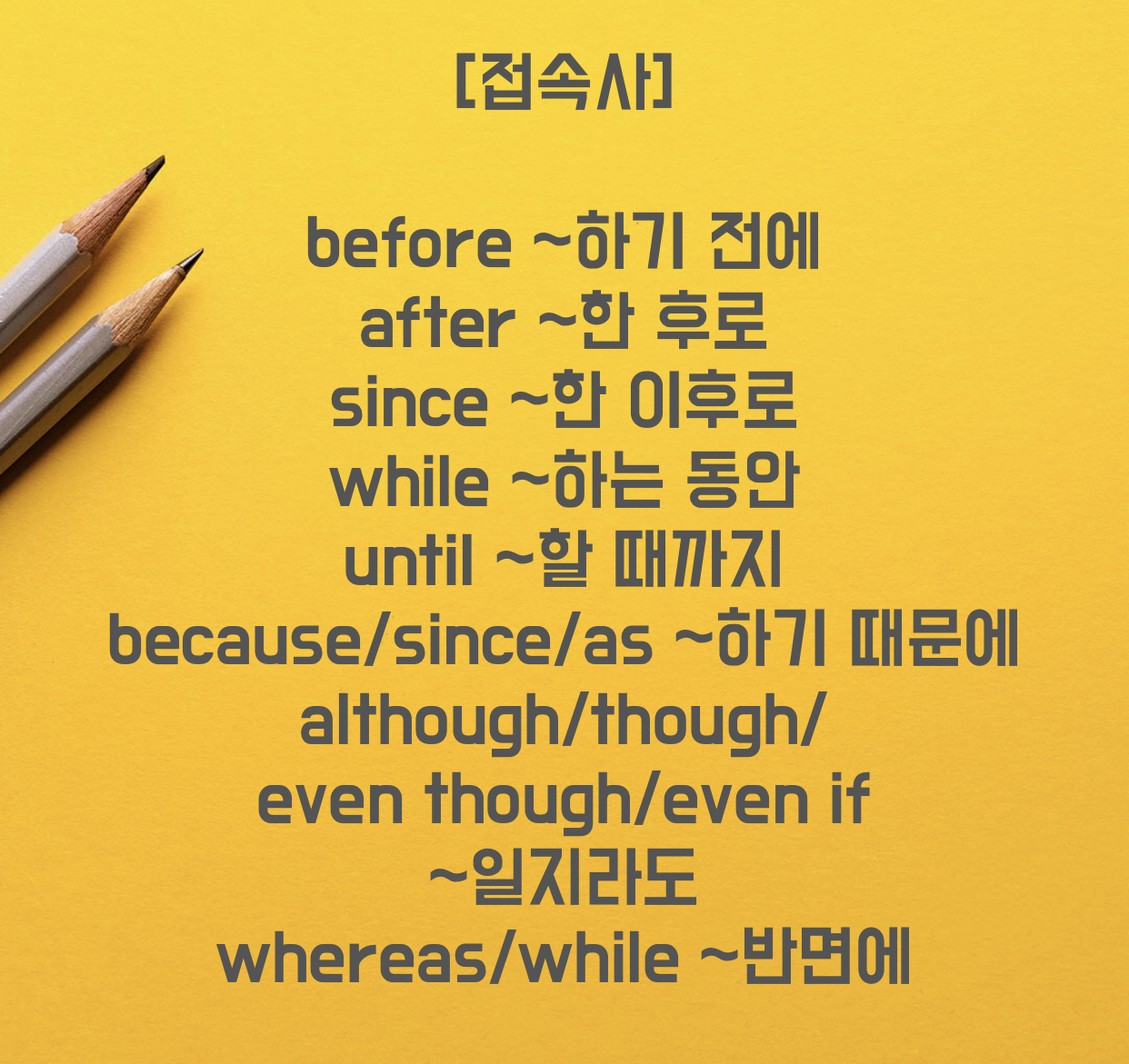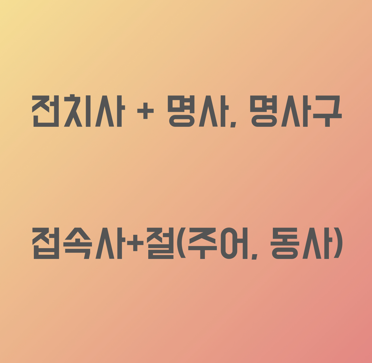 가장 기본적인 문법이니 잘 알아두셔야 해요! 이렇게 문장구조를 알았다면 어떤 게 전치사고 어떤 게 접속사인지 알아야합니다. 이걸 알아야 문제를 풀 때 그 뒤의 구조를 판단할 수 있기 때문이에요.