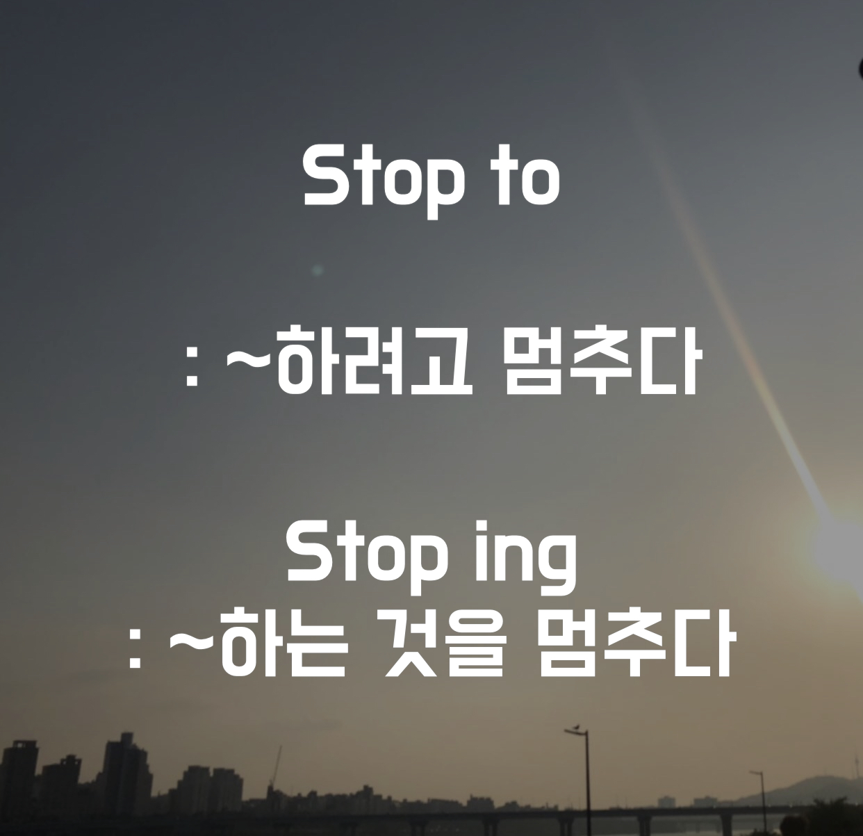 stop to와 stop ~ing인데요, 이때 stop to는 ~하려고 멈추다, ~하기 위해 멈추다로 노력을 나타내고